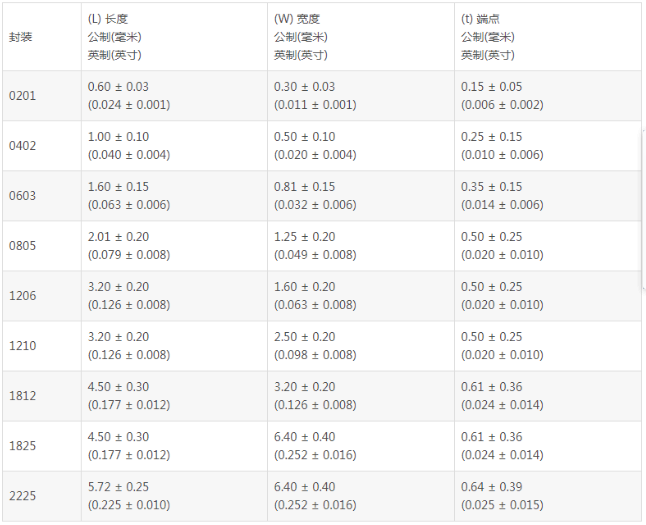 1、封裝尺寸:通用型貼片電容包括四個常用的封裝:0402、0603、0805、1206。