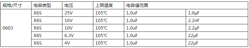 以上是國巨CC X6S 0603 貼片電容的常用參數(shù)表。